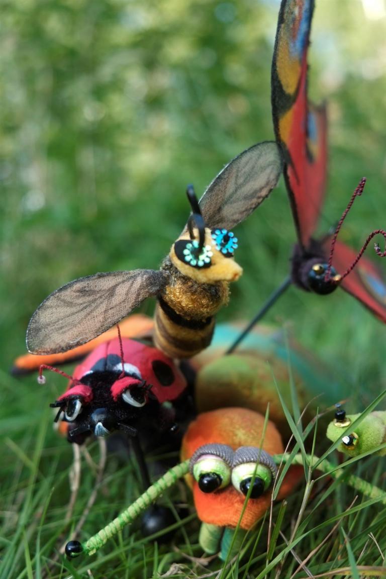 Eine Erzählerin beobachtet kleine summende, brummende Insekten (Puppen). Diese kommen geflogen und gekrabbelt. Biene, Mücke, Raupe und Marienkäfer erzählen ihre Geschichten. Ineinander verwobene Märchen werden szenisch erzählt.